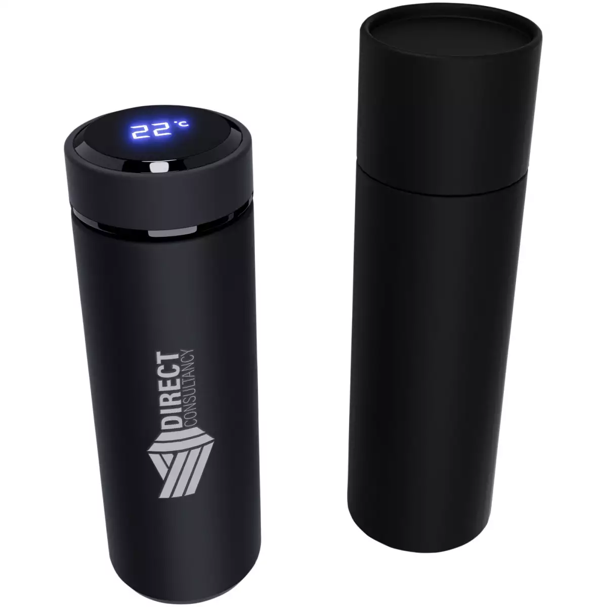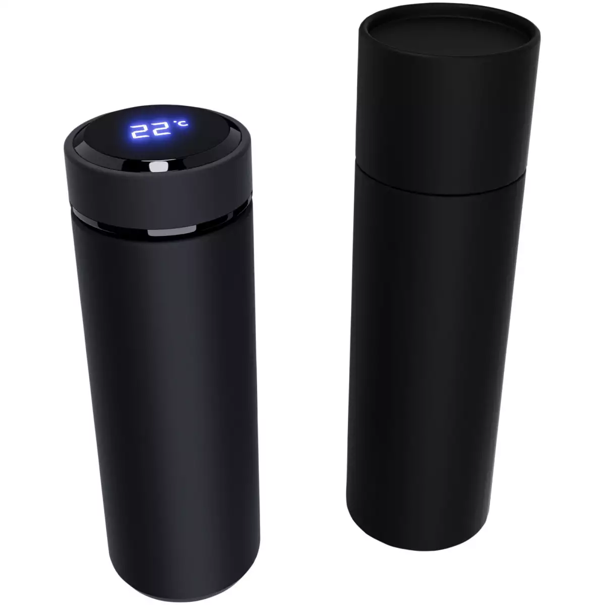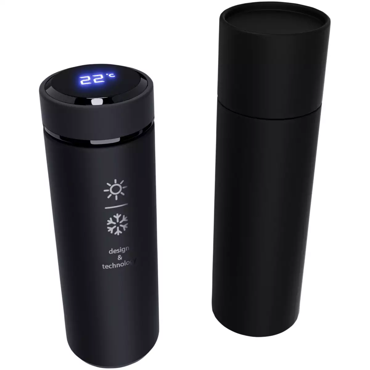 Láhev s teplotním senzorem o objemu 500ml z nerezové oceli, s dvojitou stěnou a antibakteriální vrstvou. Díky systému „Touch & Light“ se na víku láhve zobrazuje teplota nápoje (ve stupních Celsia). Vhodná pro horké i studené nápoje. Dodává se v dárkové krabičce válcového tvaru z recyklovaného papíru. Velikost: 47 × 225 mm. Baterii nelze vyměnit. Teplotu lze zobrazit až 2000×.